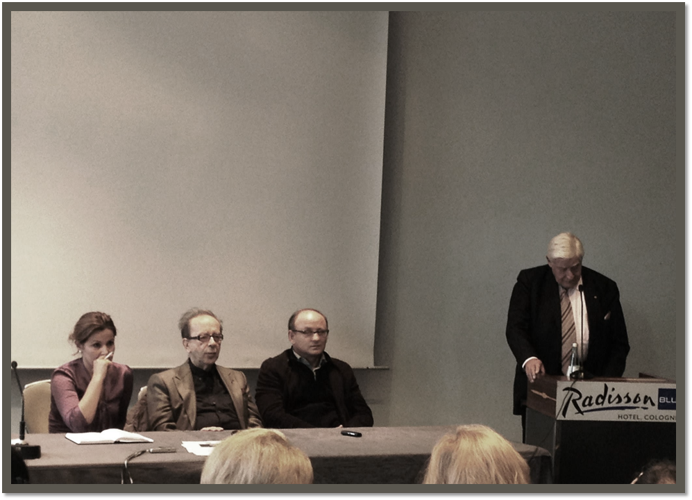 Një fjalim përshëndetës ndaj shkrimarit të shquar e mbajti Dr. Christian Schwarz-Schilling, politikan , historian dhe misionar ndërkombëtar paqeje në disa vënde të botës. Ai foli gjerësisht për nevojën dhe domosdoshmërinë e pajtimit të popujve të armiqësuar. Si njohës kompetent i historisë europiane, ai u përqëndrua tek përvoja e hidhur e Luftës së Dytë Botërore. Edhe pas gjithë kësaj tragjedie, Europa diti të gjejë rrugën drejt rehabilitimit, duke paguar më parë një çmim tmerrësisht të lartë. Dr. Schwarz-Schilling, si ishministër federal i Postës dhe Telekomunikacionit në qeverinë e Helmut Kohl-it në kohën e konfliktit në Bosnjë 1992, jep dorëheqje në shenjë proteste nga ky post i rëndësishëm. Europa u tregua e ngathët në zgjidhjen e këtij konflikti – deklaroi ai. Pesëmbëdhjetë vjet më vonë Dr. Schwarz-Schilling, si i dërguar ndërkombëtar në Bosnje, do të bënte përpjekje për të pajtuar boshnjakët me serbët. Lufta e fituar një herë ndaj së keqes nuk duhet të pushojë, sepse rreziku për rikthimin e saj është i pandërprerë. Ismail Kadare, ne kemi mësuar nga librat që keni shkruar ju dhe për këtë ju falenderojmë pa masë – do ta mbyllte fjalimin politikani, historiani, ky burrë shteti që i kishte rënë botës kryq e tërthor për zgjidhje konflikte popujsh.