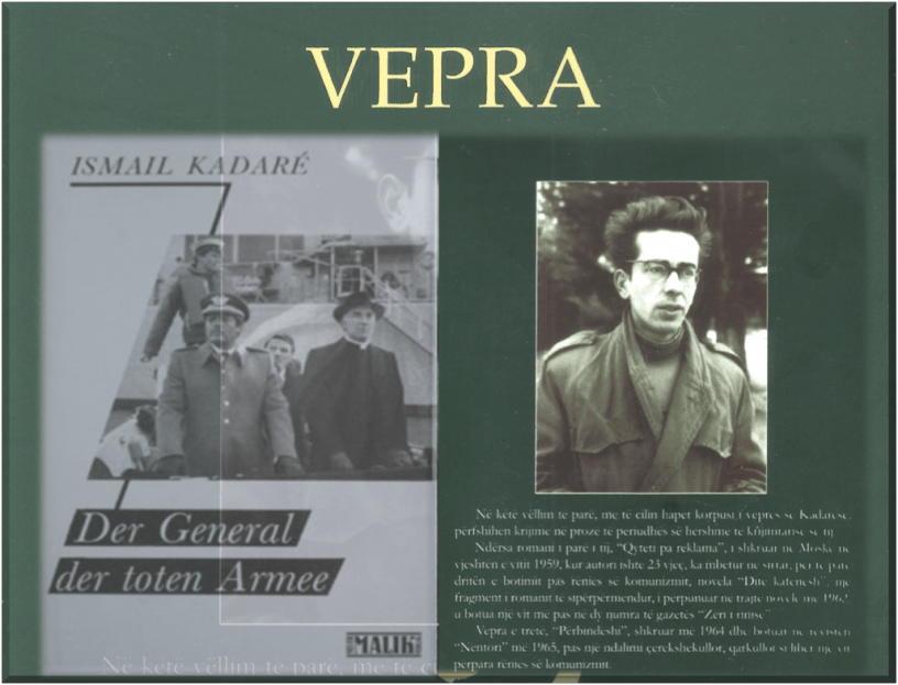 …Këta, siç duket, e kanë dasmën të shenjtë, mendoi gjenerali, ndryshe nukdo të udhëtonin natën për t’u ndodhur në një gëzim, sado i madh qoftë ky. Siç duket po bie shi i madh. Në një natë të tillë nuk është e mundur të hapësh as llogore, sepse llogorja mbushet përgjysmë me ujë.Thonë se ti mbledh të vrarët e vendit tënd. Mbase ke mbledhur shumë dhe do të mbledhësh akoma shumë të tjerë, mbase do t’i mbledhësh të gjithë, por dije mirë se njërin nuk ke për ta gjetur kurrë në jetë të jetëve, ashtu si në jetë të jetëve unë nuk do t’i gjej më kurrë vajzën time dhe burrin tim. Sa do të doja të tregoja për atë që ti nuk do ta gjesh dot kurrë, por nuk e bëj, sepse nuk dua t’u kujtoj të zezat e luftës këtyre dasmorëve. ا’shi që binte atë natë, më tepër se sonte. Ujët buiste kudo. Nuk ishte e mundur të hapje gropë, se gropa mbushej përgjysmë me ujë, një ujë i zi pis, sikur buronte nga nata. Megjithatë unë e hapa gropën. Po nuk do të tregoj asgjë për të mos prishur gëzimin e të tjerëve, qoftë edhe gëzimin tënd o i mallkuar.Gjenerali ndezi një cigare dhe për çudi cigarja e tij iu duk e vogël dhe e pafuqishme përpara çibukëve të mëdhenj prej shqope, të zinj e të gjatë, që i mbanin pleqtë në duart e tyre të rreshkura, duke i thithur herë pas here midis fjalëve që thoshin, sikur të mbanin me ta ritmin e shtruar të bisedës.I zoti i shtëpisë, ai plaku i vjetër që e priti në fillim fare në korridor, erdhi e u ul pranë gjeneralit, me çibuk në dorë si gjithë pleqtë e tjerë dhe me një medalje të verdhë që i tundej mbi rrotën e zezë prej shajaku. I njihte këto medalje të verdha që mbanin shpesh në gjokse fshatarët dhe i dukej gjithmonë se pas çdo medaljeje të tillë ishte fytyra e zbehtë e një ushtari të vrarë nga ushtria e tij.Gjenerali i buzëqeshi fytyrës plot rrudha të plakut, që i kujtoi një copë trung të tharë e të plasaritur, por akoma të fuqishëm. Një njeri që e kishte përkrah, ai që i kishte thirrur në fillim „ngrejeni gotën“, i përktheu fjalët e para të plakut. I zoti i shtëpisë i kërkoi ndjesë mysafirit që nuk e mbajti me muhabet, sepse miqtë akoma s’kishin mbaruar së ardhuri dhe atij i duhej t’i priste të gjithë.Gjenerali tha disa „Ju lutem, ju lutem“ dhe „Ju falem nderit“ duke duke tundur kokën. Plaku heshti dhe thithi çibukun ngadalë. Pastaj pyeti me zë të qetë.